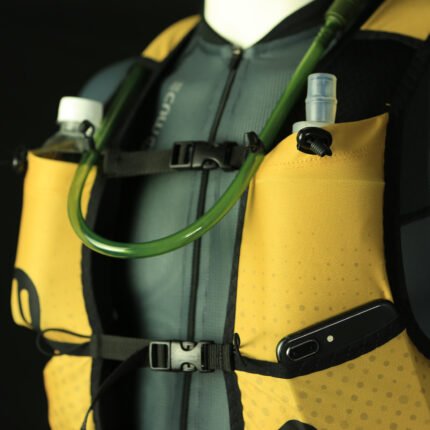 - Los 2 bolsillos frontales para cantimploras están diseñados para adaptarse a cualquier cantimplora blanda, estos bolsillos frontales limitan el rebote.